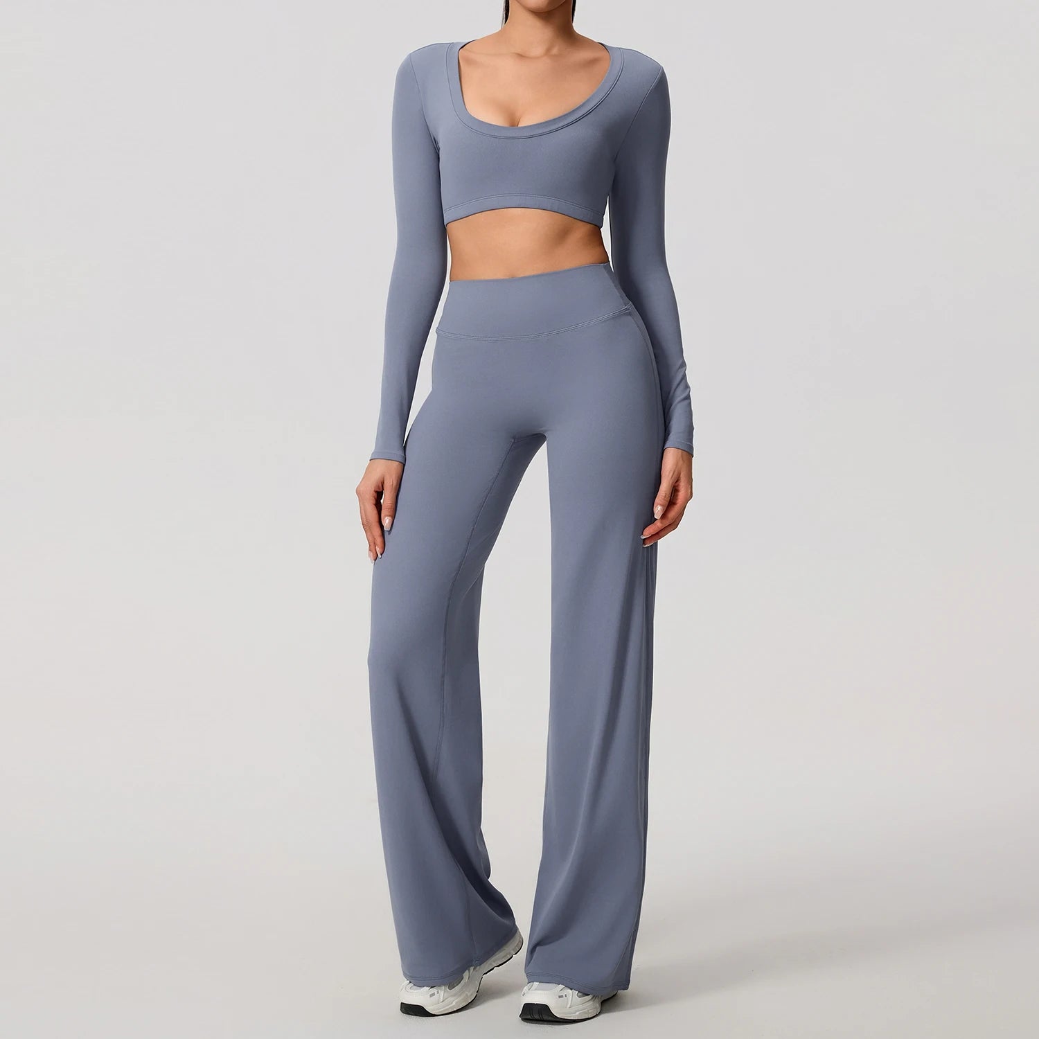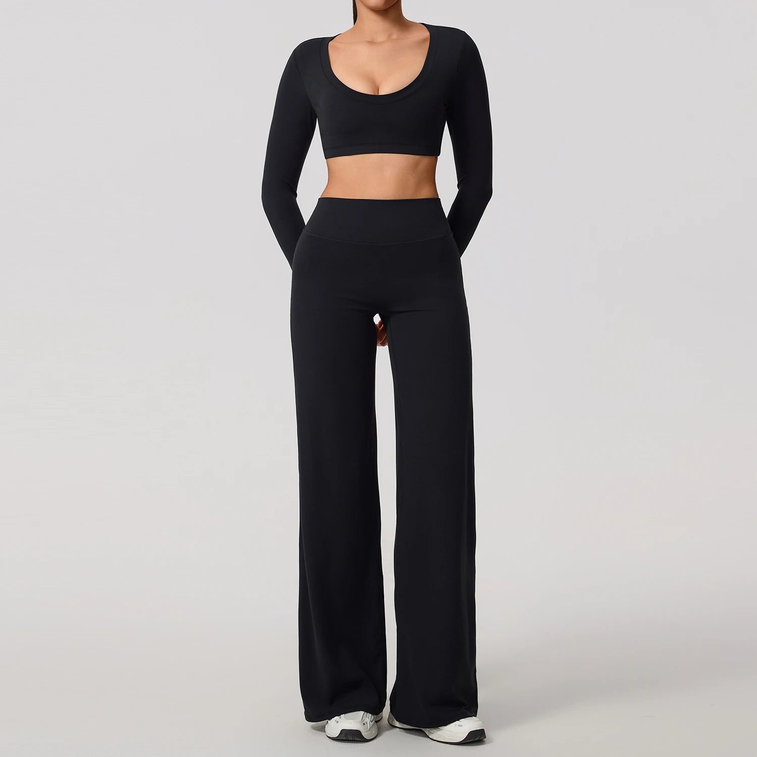 Com design moderno e sofisticado, o top de manga longa possui costas totalmente abertas, valorizando a silhueta e garantindo liberdade de movimentos. A calça de modelagem reta e cintura alta oferece caimento impecável, alongando a silhueta e proporcionando máximo conforto durante treinos ou uso casual.